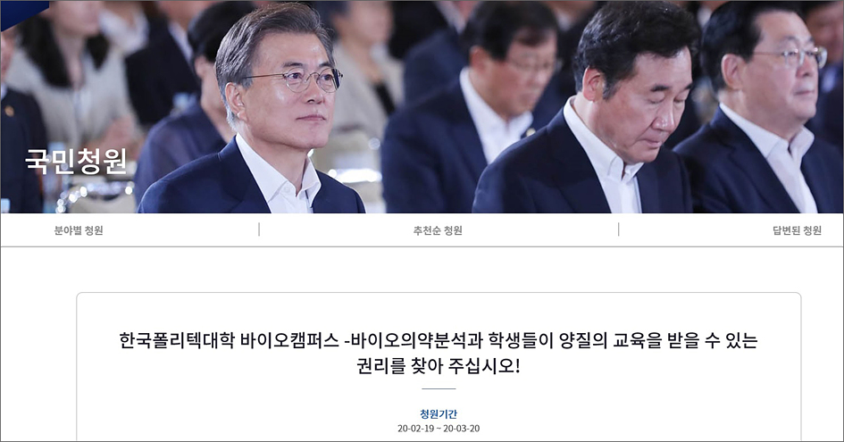 한겨레신문, TJB 뉴스등에서 보도된바 처럼, 이번 봄 개강을 앞두고 논산의 폴리텍 바이오 캠퍼스의 엄준철 학장의 이해할수 없는 보복성 인사조치가 청와대 국민청원 (https://www1.president.go.kr/petitions/Temp/CCKFDk) 등 큰 논란을 일으키고 있다고 한다.