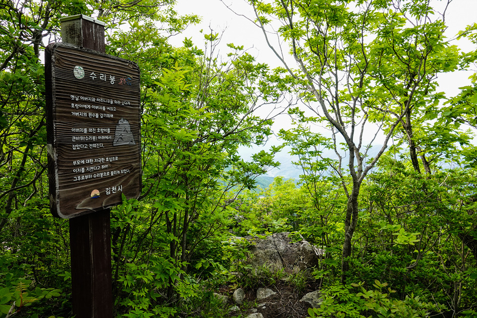 그곳에서 조금 아래쪽에 수리봉 안내판이 있고 벤치가 보인다.